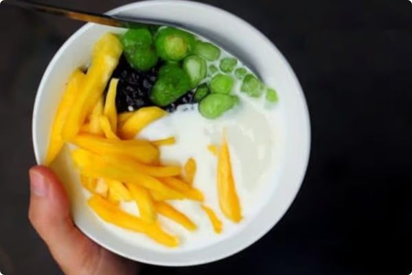 Sữa chua sử dụng trong món này thường có độ chua nhẹ, không quá gắt, giúp cân bằng vị ngọt tự nhiên của trái cây và nếp cẩm.